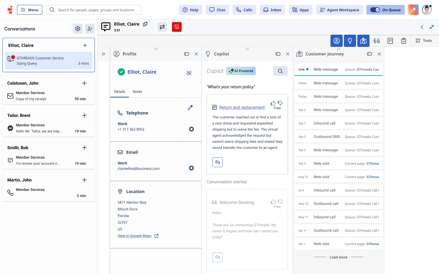 Behalten Sie die gesamte Interaktion, einschließlich historischer Konversationen, im Blick, damit Kunden sich nicht wiederholen müssen. Aufgrund der vollständigen Historie können Mitarbeiter jederzeit einen nahtlosen, personalisierten Service bieten, ganz gleich, wann und wo das Gespräch beginnt.