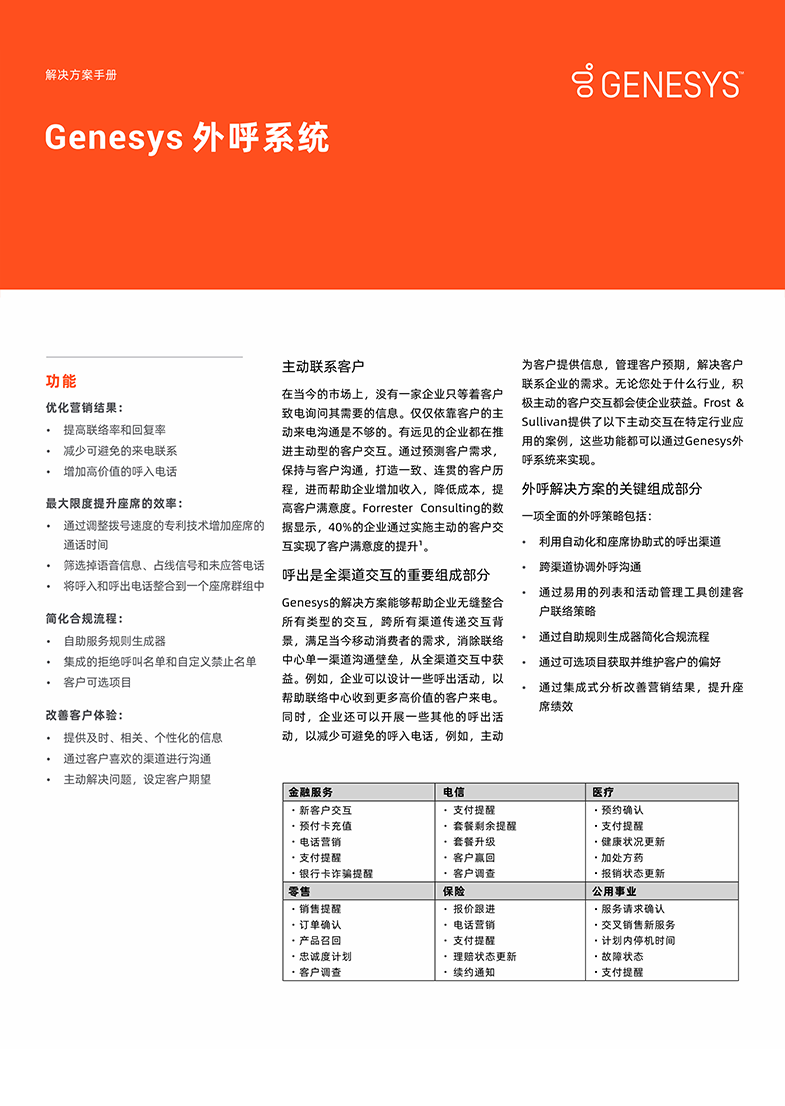 Genesys的解决方案能够帮助企业无缝整合所有类型的交互,跨所有渠道传递交互背景,满足当今移动消费者的需求,消除联络中心单一渠道沟通壁垒,从全渠道交互中获益。例如,企业可以设计一些呼出活动,以帮助联络中心收到更多高价值的客户来电。同时,企业还可以开展一些其他的呼出活动,以减少可避免的呼入电话,例如,主动为客户提供信息,管理客户预期,解决客户联系企业的需求。无论您处于什么行业,积极主动的客户交互都会使企业获益。Frost & Sullivan提供了以下主动交互在特定行业应用的案例,这些功能都可以通过Genesys Outbound来实现。